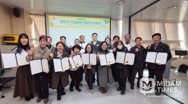 미담타임스 김준완 기자 | 순천시는 지난 11일 순천시 업사이클센터 더새롬에서 자원순환 실천을 선도할 시민 자원순환 활동가 17명에게 위촉장을 전달했다.