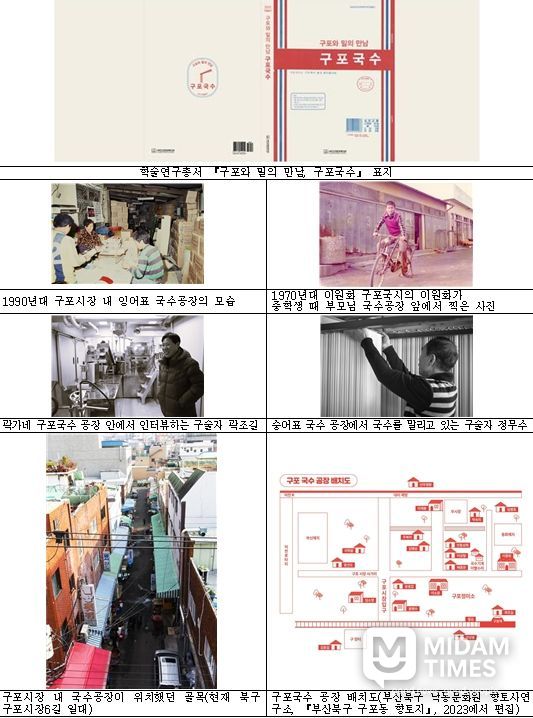 사진 자료에는 문헌자료, 국수 생산 장면, 구포시장 풍경 등을 수록하여 글자(텍스트)와 현장의 이미지를 함께 확인할 수 있도록 구성했다.