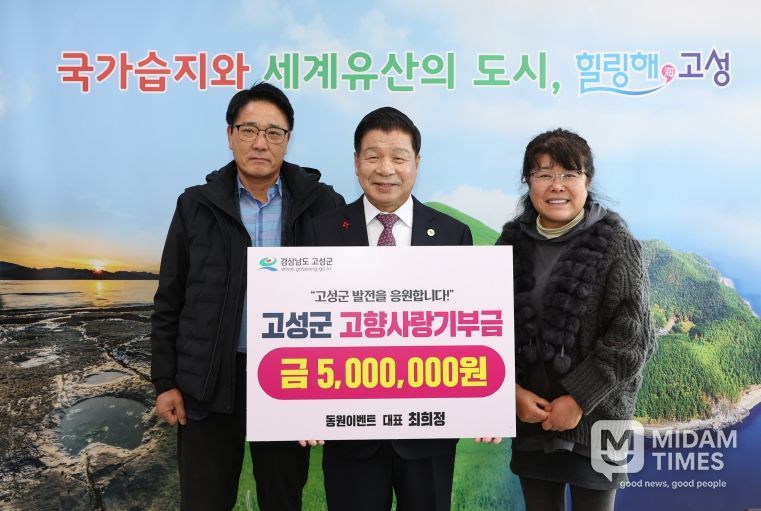 미담타임스 김교환 기자 | 고성군은 12월 17일, 이벤트·행사대행업체 동원이벤트의 최희정 대표가 고향사랑기부금 500만 원을 기탁했다고 밝혔다.