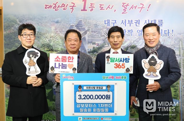 미담타임스 김교환 기자 | 대구 달서구는 삼보모터스 1차벤더 일송회(회장 권원기) 회원들로부터 관내 취약계층 지원을 위한 이웃사랑 후원금 320만 원을 기탁받았다고 18일 밝혔다.