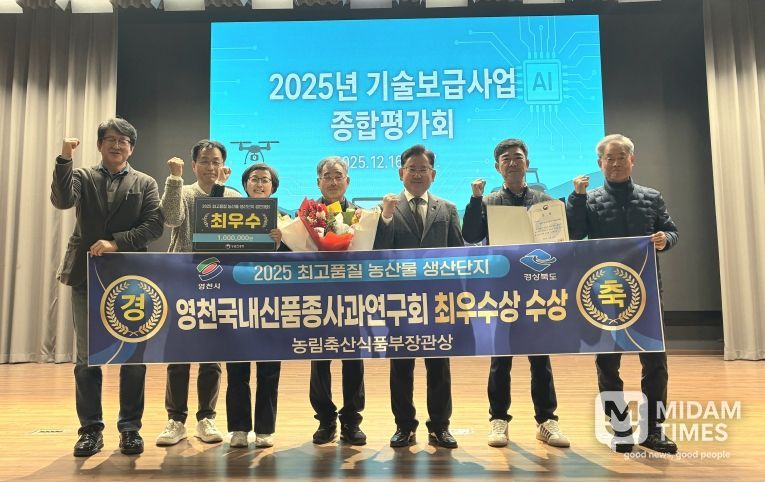 미담타임스 김준완 기자 | 영천국내신품종사과연구회(회장 정영철)가 농촌진흥청이 주관한 ‘2025년 최고품질 농산물 생산단지’ 경진대회에서 최우수 단지(농림축산식품부장관상)로 선정됐다. 기후 온난화로 영천 지역의 사과 재배 여건에 대한 우려가 커지고 있는 가운데 거둔 성과로 더욱 값지다는 평가다.