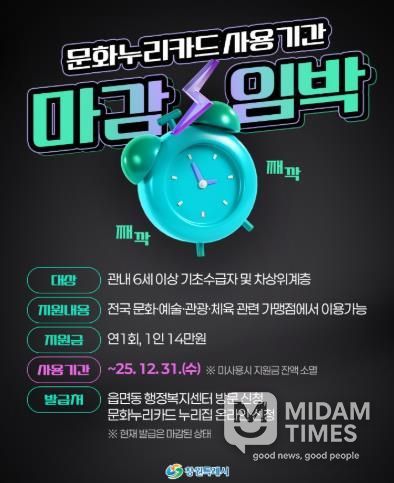 미담타임스 김교환 기자 | 창원특례시는 취약계층의 문화생활을 지원하는 복지카드 ‘문화누리카드’의 사용 기간이 오는 31일 종료된다고 밝혔다.