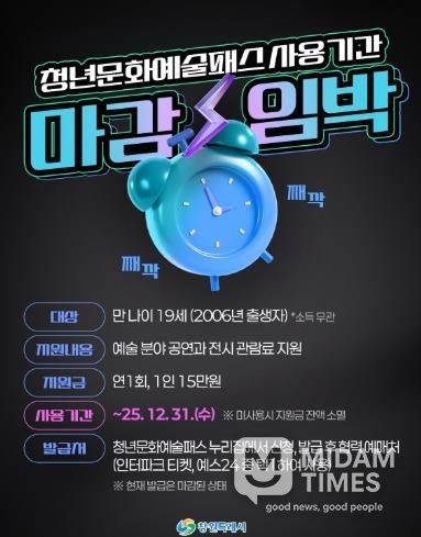 미담타임스 김교환 기자 | 창원특례시는 2006년생을 대상으로 지급한 ‘청년문화예술패스’ 포인트 사용기한이 올해 12월 31일 관람분까지로 종료됨에 따라, 아직 포인트를 사용하지 않은 청년들에게 서둘러 이용해 줄 것을 당부했다.