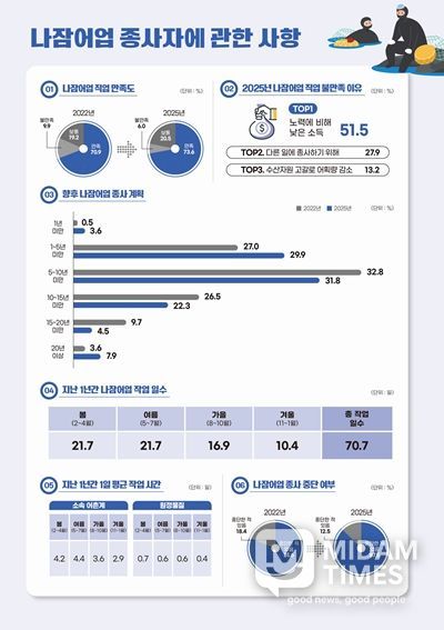 직업 만족도의 경우 응답자의 73.6%가 나잠어업에 만족한다고 응답해 전 주기 대비 2.7%p 증가했다. 불만족 사유로는 ‘노력에 비해 소득이 낮아서’(51.5%), ‘다른 일에 종사하기 위해’(27.9%) 순으로 나타났다.