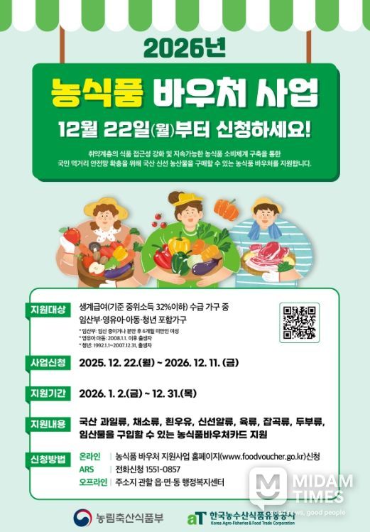 2025년 수급 가구 중 12월 22일 기준 지원 자격요건을 충족하는 경우 별도의 신청 절차 없이 자동으로 신청 처리되며, 2026년 신규 신청 대상자는 22일부터 주민등록 주소지 관할 행정복지센터 방문 또는 농식품 바우처 누리집, 자동응답전화 서비스(1551-0857)를 통해 연중 신청할 수 있다.