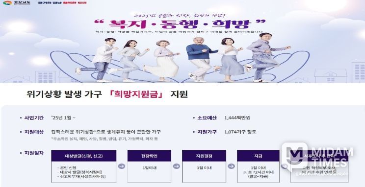 미담타임스 김교환 기자 | 경상남도는 올해부터 시행하고 있는 경남형 긴급복지 제도인 ‘희망지원금’을 연말까지 차질 없이 위기 도민에게 지원할 계획이라고 밝혔다.