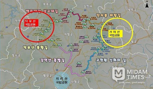 테마는 △단지봉 바람길(수행과 명상) △고천원 신화의 길(고천원 신화와 온천힐링) △감악산 꽃별길(합천호 전망과 별빛 트레킹) △덕유산 봉황길(1,500m급 고봉 도전) △백두대간 상고대길(상고대와 약초체험) 등으로 구성된다.