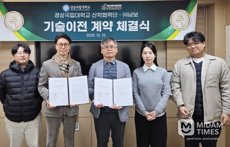 미담타임스 김교환 기자 | 경상국립대학교 산학협력단(단장 최병근)은 12월 12일 주식회사 남보(대표 박순한)에 ‘살충제 탑재 기능성 바이오차 활용 농업용 비료 및 농자재 제조 방법’과 12월 10일 국가탄소은행(대표 류성기)에 ‘바이오차 활용 고성능 에어필터 제조 방법’ 관련 기술(연구책임자 서동철 농업생명과학대학 환경생명화학과 교수) 2건을 이전했다.