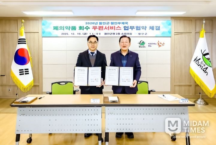 미담타임스 김교환 기자 | 함안군은 19일 함안군청 본관 2층 회의실에서 함안우체국과 ‘폐의약품 회수 우편서비스 업무협약’을 체결했다.
