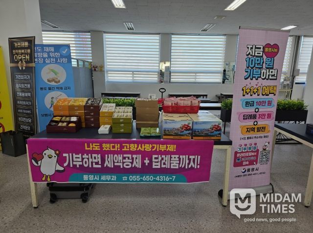 통영시는 점심시간을 활용해 임직원을 대상으로 제도를 안내하고 현장 기부 행사를 진행했다. 기부에 참여한 직원에게는 욕지고구마, 통영웰빙건강빵, 멸치오란다를 추가로 증정하는 이벤트를 함께 운영해 적극적인 참여를 이끌어냈다.