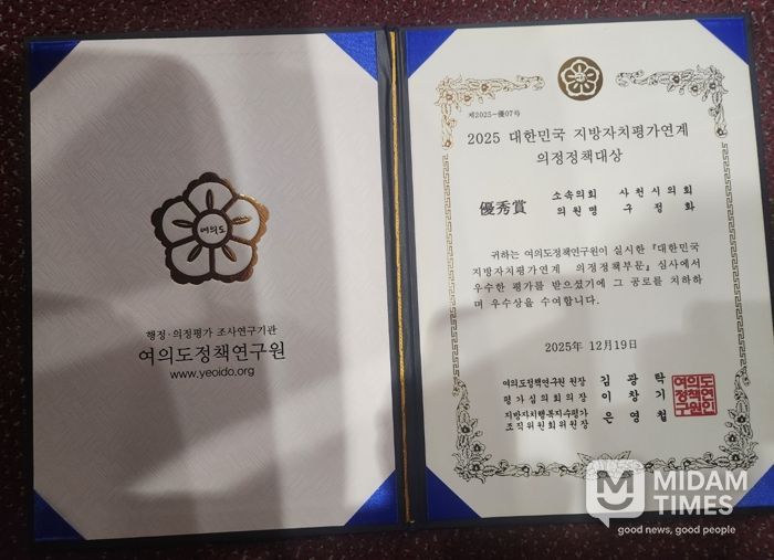 미담타임스 김교환 기자 | 사천시의회 구정화 의원이 12월 19일, 국회의사당에서 열린 여의도정책연구원 주최 ‘2025 지방자치평가 의정정책 우수상’을 수상했다.