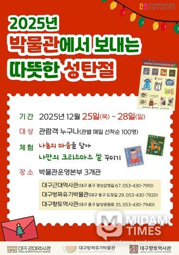 미담타임스 김교환 기자 | 대구문화예술진흥원 박물관운영본부 소속 대구 시립 3개 박물관(대구근대역사관·대구방짜유기박물관·대구향토역사관)에서는 성탄절을 맞아, 12월 25일부터 28일까지 관람객을 대상으로 ‘2025년 박물관에서 보내는 따뜻한 성탄절 –나만의 크리스마스 씰 꾸미기-’ 문화행사를 진행한다.