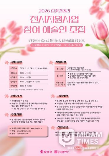 미담타임스 김교환 기자 | (재)달성문화재단은 오는 22일부터 31일까지 ‘2026 참꽃갤러리 전시지원사업 참여예술인’을 모집한다.