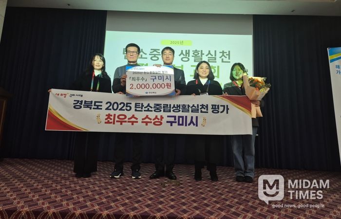 미담타임스 김준완 기자 | 구미시는 19일 경상북도 주최로 호텔금오산에서 열린 ‘2025년 탄소중립 생활실천 평가보고회’에서 최고 등급인 최우수상을 수상했다. 지난해 우수상에 이어 한 단계 높은 평가를 받으며 생활 속 탄소중립 실천 성과를 다시 한번 인정받았다.