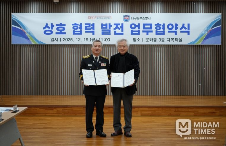 미담타임스 김교환 기자 | (재)대구광역시동구문화재단(이사장 윤석준)과 대구동부소방서가 지난 12월 19일, 지역 문화시설의 안전관리 강화와 재난 대응 협력 구축을 위한 업무협약(MOU)을 체결했다.