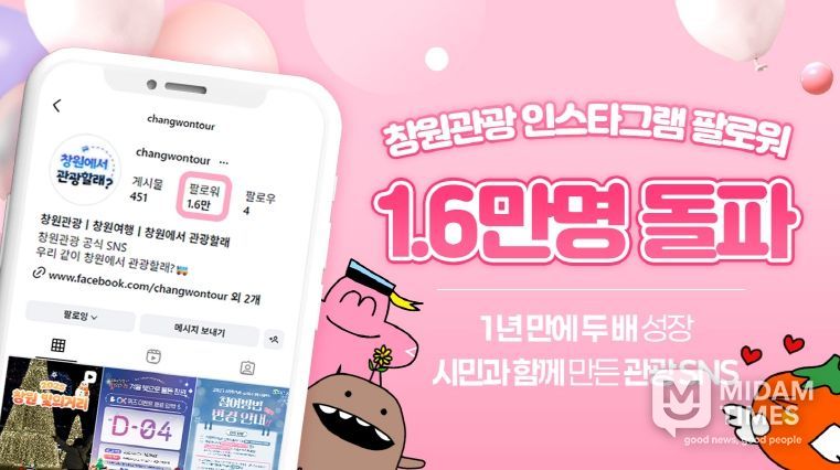 미담타임스 김교환 기자 | 창원특례시는 창원관광 공식 인스타그램 채널이 올해 말 기준 팔로워 수 1만 6,000명을 돌파하며, 지난해 연말 약 9천 명 대비 1년 만에 두 배 가까운 성장을 기록했다고 22일 밝혔다.