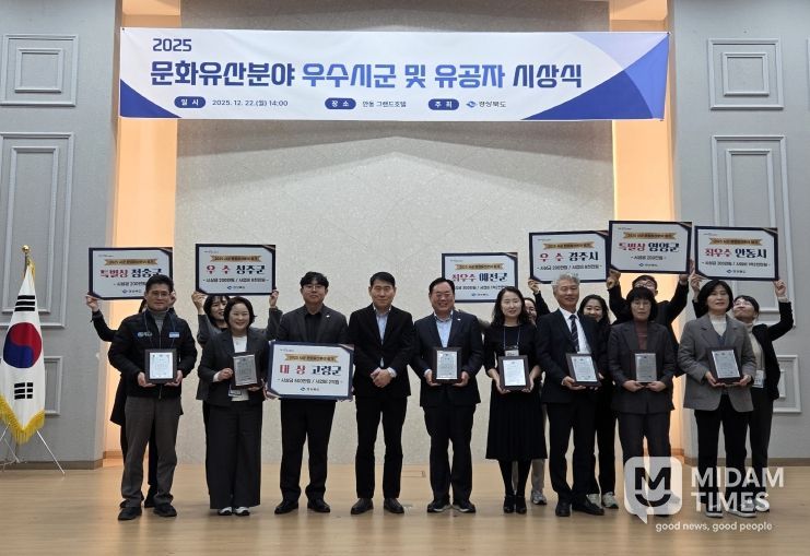 미담타임스 김준완 기자 | 경상북도는 22일 안동 그랜드호텔에서 문화유산 보존과 활용 분야에서 탁월한 성과를 거둔 7개 시군을 선정해 ‘2025년 문화유산 분야 우수 시군’시상식을 개최하고 그간의 노고를 격려했다.