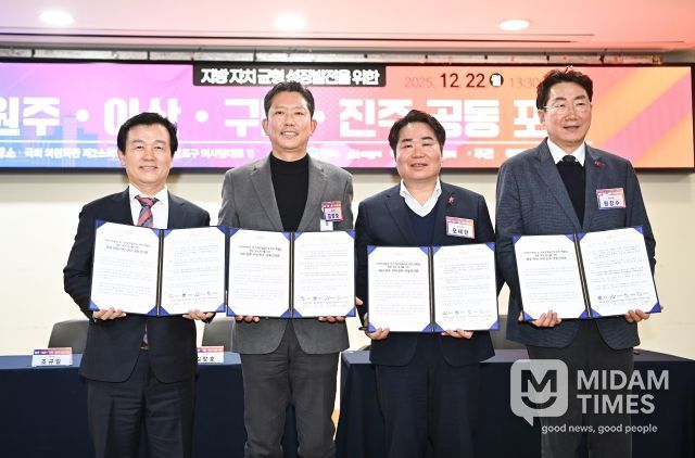 미담타임스 김준완 기자 | 구미시는 원주시·아산시·진주시와 함께 12월 22일 국회의원회관 제2소회의실에서 ‘지방자치와 지역균형성장을 위한 공동포럼’을 개최하고,'지방자치분권 및 지역균형발전에 관한 특별법(이하 지방분권균형발전법)' 개정을 촉구하는 공동건의문을 채택했다.