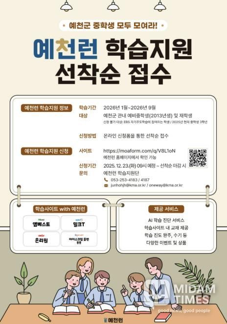 미담타임스 김준완 기자 | 예천군은 지역 청소년의 학습격차 해소와 자기주도학습 역량 강화를 위해 추진 중인 AI 기반 학습지원 사업 ‘예천런’에 참여할 예비 중학교 1학년 및 재학생을 추가 모집한다.