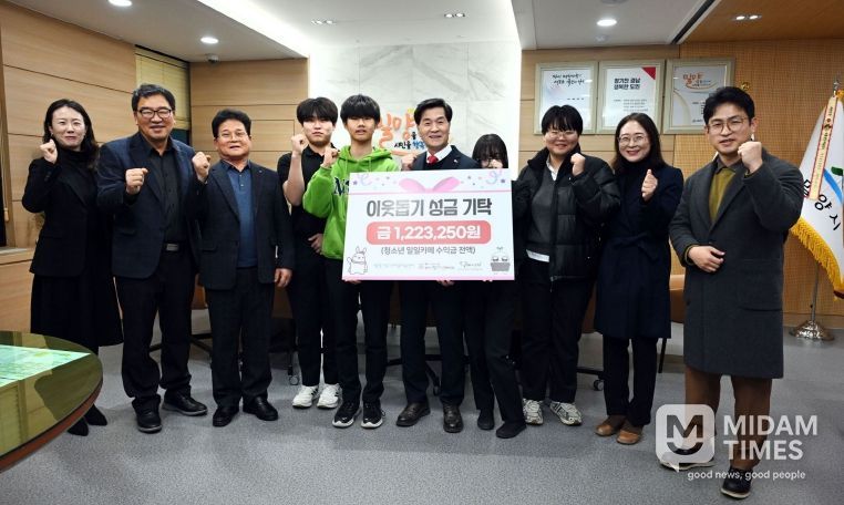 미담타임스 김교환 기자 | 밀양시는 지난 22일 청소년문화의집 소속 청소년들이 시장실을 방문해 직접 운영한 일일카페 수익금 122만 3,250원을 연말 이웃돕기 성금으로 기부했다고 밝혔다.