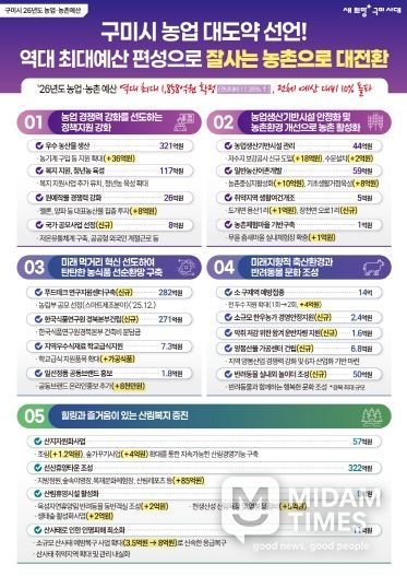 김장호 구미시장은 “농업과 농촌은 구미의 지속 가능한 성장을 떠받치는 중요한 기반”이라며 “이번 예산이 농업인의 경영 안정과 농촌 경쟁력 강화에 실질적인 도움이 되기를 기대한다”고 말했다.