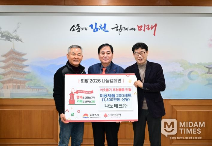 미담타임스 김준완 기자 | 김천시는 지난 23일, 나노테크㈜(대표 김정헌)으로부터 어려운 이웃을 위한 미용 제품 200상자(1,300만 원 상당)를 전달받았다고 밝혔다.