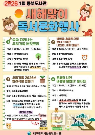 미담타임스 김교환 기자 | 대구동부도서관은 다가오는 새해를 맞아 지역주민이 도서관에서 뜻깊은 한 해를 시작할 수 있도록 1월 한 달간 동부도서관 ‘새해맞이 특별 독서문화행사’를 운영한다.