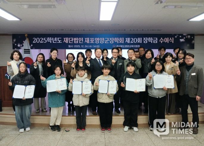 미담타임스 김준완 기자 | 경상북도영양교육지원청은 12월 24일 관내 초등학교 6명을 대상으로 재단법인 재포영양군장학회가 주관하는 2025학년도 재단법인 재포영양군장학회 제20회 장학금 수여식을 영양교육지원청 3층 대회의실에서 실시했다.