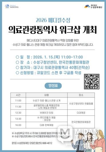 워크숍 참가 신청은 홍보 포스터 내 큐알(QR) 코드 또는 ‘메디컬 수성’ 공식 인스타그램 링크를 통해 가능하다. 문의 사항은 수성문화재단 관광진흥센터로 하면 된다.
