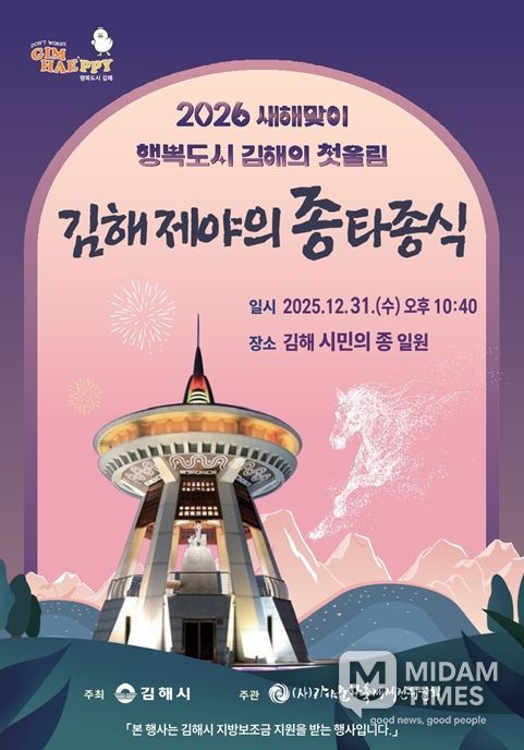 김해시 관계자는 “김해시민의 종은 가야의 역사와 시민의 염원이 담긴 상징적인 공간”이라며 “시민이 직접 참여해 희망과 화합의 메시지를 나누고 시민 모두에게 희망찬 새해의 첫 울림이 전해지길 바란다”고 밝혔다.
