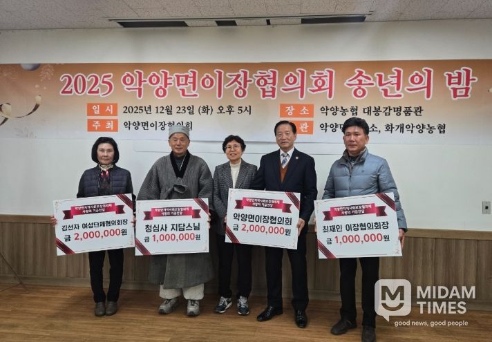 악양면은 이장협의회를 비롯한 여성단체협의회 김선자 회장, 최재인 이장협의회장, 청심사 지담스님, 익명의 기부자 등이 총 700만 원의 기부금을 전달했다고 밝혔다.