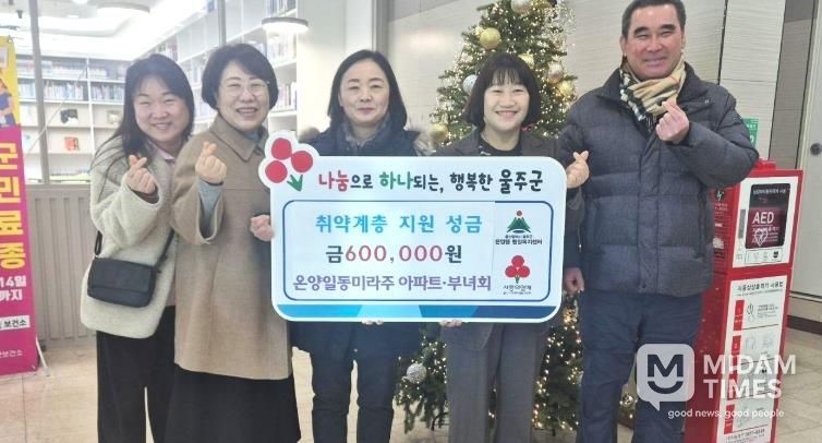 미담타임스 김준완 기자 | 온양일동미라주아파트와 부녀회가 26일 울주군 온양읍 행정복지센터에 지역 취약계층을 위한 성금 60만원을 전달했다.