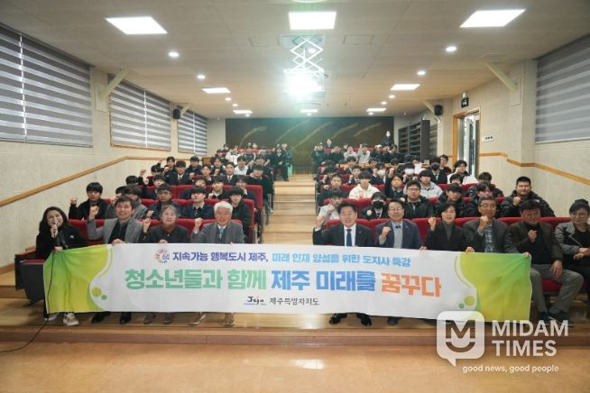 ‘청소년들과 함께 제주 미래를 꿈꾸다’를 주제로 진행된 이날 강연은 2024년 표선고, 한림공고, 한국국제학교(KIS)를 거쳐 올해 제주중앙고, 중문고, 남원중에 이어 일곱 번째로 마련됐다.