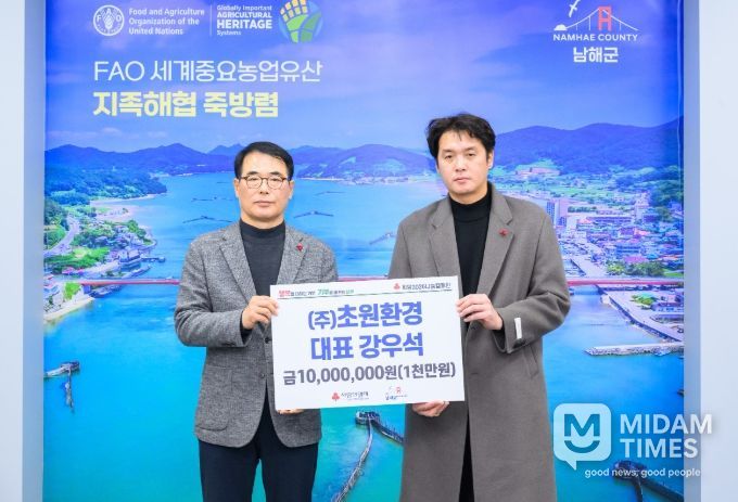 미담타임스 김교환 기자 | 남해군은 지난 24일 ㈜초원환경(대표 강우석)에서 연말 이웃돕기 성금 1천만 원을 기탁했다고 밝혔다.