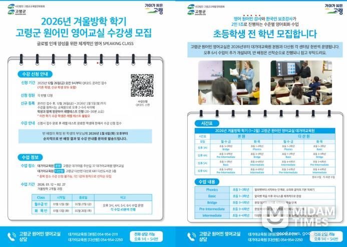 미담타임스 김준완 기자 | 사)고령군교육발전위원회는 고령군 초등학생들의 영어 실력 향상과 글로벌 감각을 키우기 위해 ‘2026년 고령군 원어민 영어교실'을 운영한다.