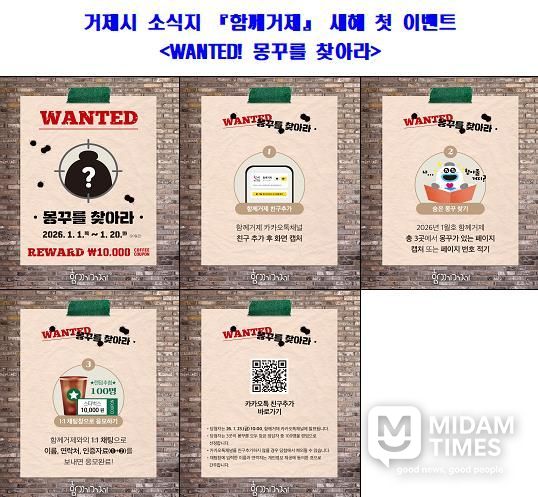 미담타임스 김교환 기자 | 거제시 시정소식지 ‘함께거제’가 2026년 새해를 맞아 시민이 자연스럽게 시정홍보 콘텐츠를 접하고 즐길 수 있도록, 구독 참여를 유도하는 특별 이벤트 'WANTED! 몽꾸를 찾아라'를 1월 1일부터 20일까지 20일간 진행한다.