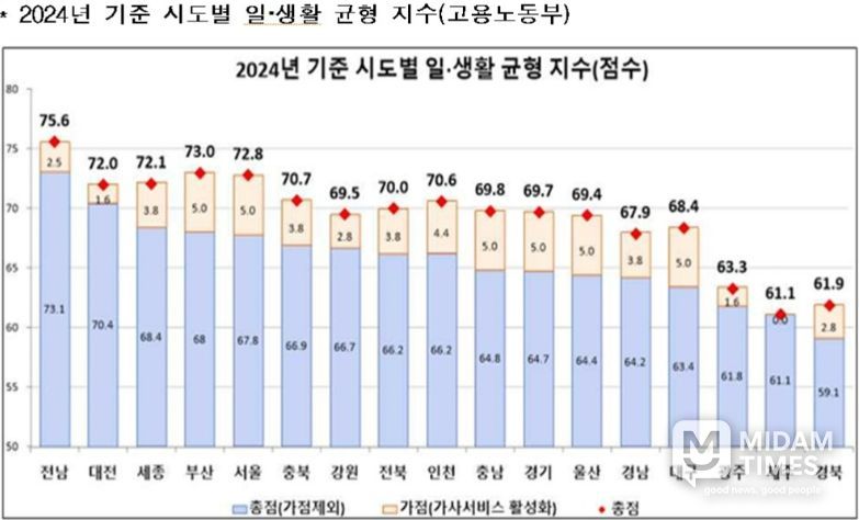 2024년 일·생활 균형지수 평가 결과, 전국 17개 시·도 평균은 65.7점이며 전남은 이보다 7.4점 높았은 점수를 기록했다.