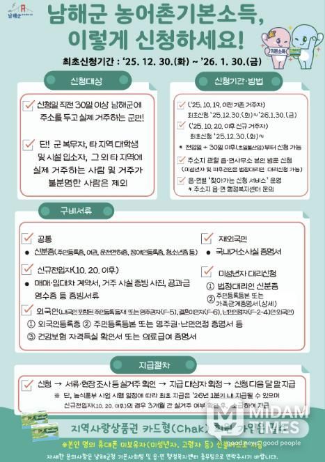 미담타임스 김교환 기자 | 남해군은 ‘농어촌 기본소득 시범사업’ 신청 접수를 오는 12월 30일부터 2026년 1월 30일까지 실시한다고 밝혔다.