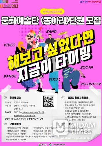 미담타임스 김교환 기자 | 양산시 소주청소년문화의집은 청소년의 문화예술 역량 강화와 자율적인 동아리 활동 지원을 위해 '2026 소주청소년문화의집 청소년문화예술단' 단원을 모집한다.