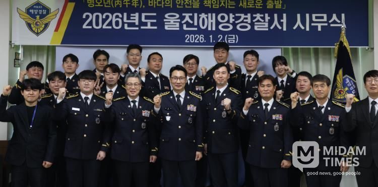 미담타임스 김준완 기자 | 울진해양경찰서는 2일, 울진해양경찰서 회의실에서 서장을 비롯한 각 과·계장, 재박 함·정장이 참석한 가운데 2026년도 시무식을 개최했다.