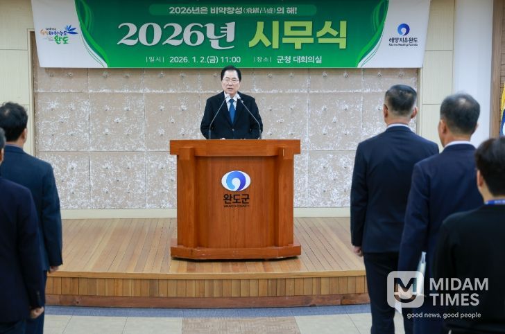 미담타임스 정인화 기자 | 신우철 완도군수는 2일 시무식에서 올해의 화두를 ‘힘차게 도약하여 왕성하게 번창한다’는 뜻의 ‘비약창성(飛躍昌盛)’으로 정하고 그동안 쌓아온 성과를 토대로 도약을 이룩하겠다는 포부를 밝혔다.