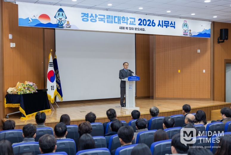 미담타임스 김교환 기자 | 경상국립대학교는 1월 2일 오전 11시 가좌캠퍼스 박물관 대강당에서 2026년 시무식을 개최했다. 시무식은 개식, 국민의례, 총장 신년사, 시상식, 폐식, 기념촬영의 순으로 진행됐다.
