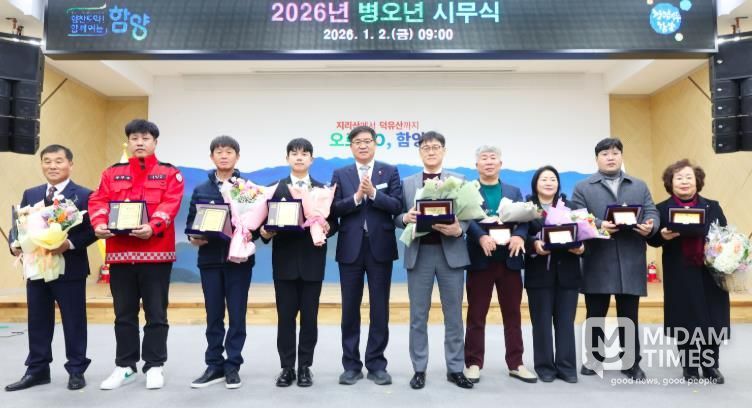 미담타임스 김교환 기자 | 함양군은 2일 오전 9시 군청 대회의실에서 공무원, 유관기관, 민간인 등 150여 명이 참석한 가운데 ‘2026년 병오년 시무식’을 개최했다.