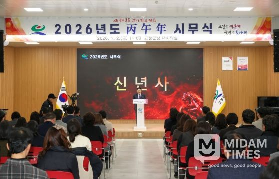 미담타임스 김교환 기자 | 고성군은 1월 2일, 군청 5층 대회의실에서 2026년도 시무식을 열고 새해 군정 운영의 힘찬 출발을 알렸다. 이날 시무식은 국민의례를 시작으로 반부패·청렴 선서, 시상, 군수 신년사, 직원과의 신년인사 순으로 진행됐다.