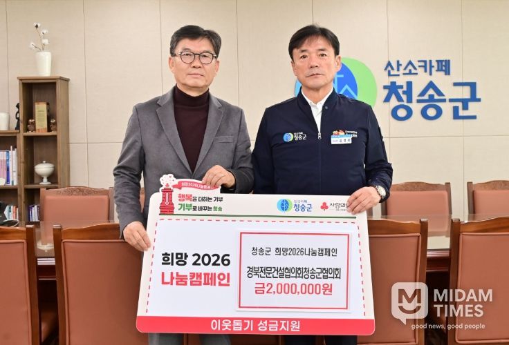 미담타임스 김준완 기자 | 청송군은 5일 경북전문건설협의회청송군협의회(회장 김만근)가 청송군을 방문해 지역 내 어려운 이웃을 돕기 위한 성금 200만 원을 기탁했다고 밝혔다.