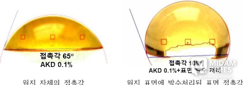 연구진에 따르면, 실제로 내첨 AKD 0.1%만 적용했을 때 접촉각이 약 65° 수준인 반면, 동일 조건에서 표면 발수 처리를 병행하면 접촉각이 약 108°까지 비약적으로 증가하여, 내첨 AKD 사용량을 최대 70%까지 절감할 수 있음을 확인했다.