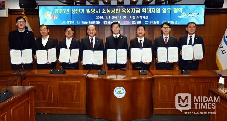 미담타임스 김교환 기자 | 밀양시는 6일 경남신용보증재단, NH농협은행, BNK경남은행, 우리은행, 새마을금고와 ‘2026년 상반기 소상공인 육성자금 확대 지원’을 위한 업무협약을 체결했다.
