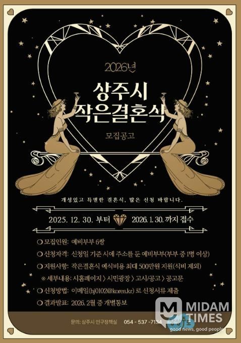 미담타임스 김준완 기자 | 상주시는 2026년 작은결혼식 예비부부 6쌍을 2025년 12월 30일부터 2026년 1월 30일까지 모집한다.