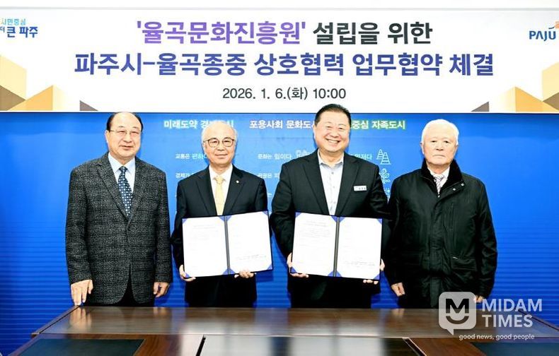미담타임스 정주환 기자 | 파주시가 율곡 이이 선생의 학문과 철학을 체계적으로 계승하기 위해 추진 중인 ‘율곡문화진흥원’설립을 위해 지난 6일 율곡 선생의 후손인 덕수 이씨 종중과 업무협약을 체결했다.