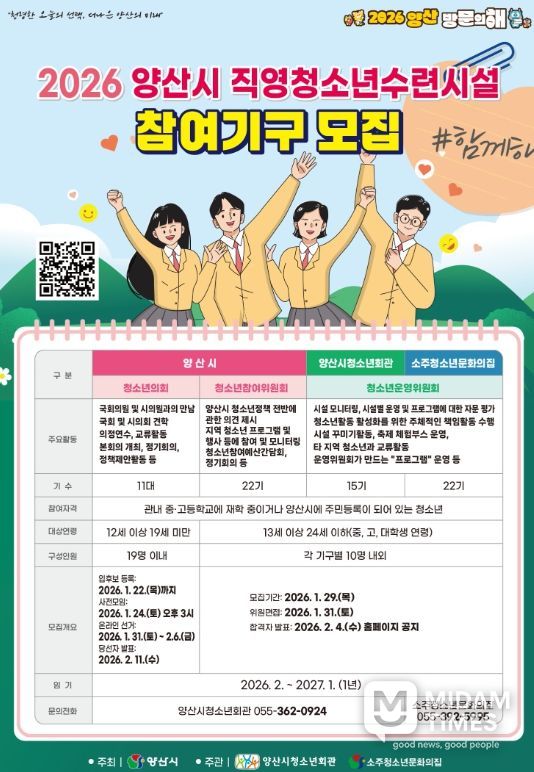 미담타임스 김교환 기자 | 양산시와 양산시청소년회관, 소주청소년문화의집은 청소년의 자치활동을 보장하고 청소년의 의견을 반영하기 위해 직영 운영하는 청소년참여기구 위원을 모집한다.